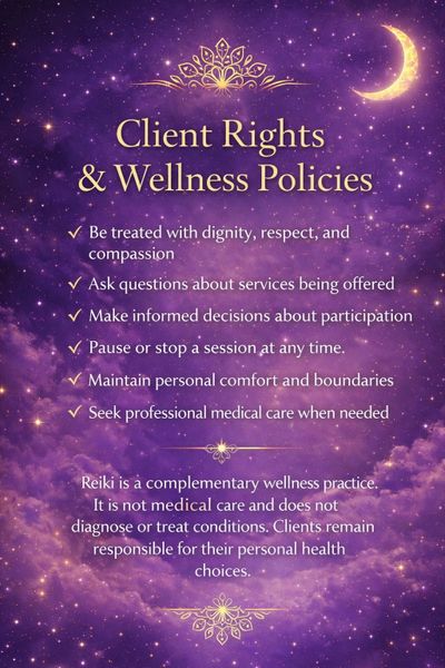 • Reiki and energy healing are holistic wellness practices and are not substitutes for licensed medical or psychological care.